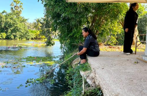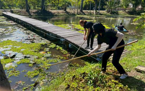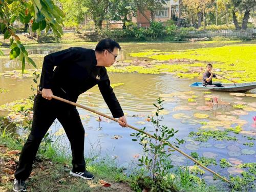 - การจัดเก็บดอกจอกและผักตบชวาภายในสระน้ำ